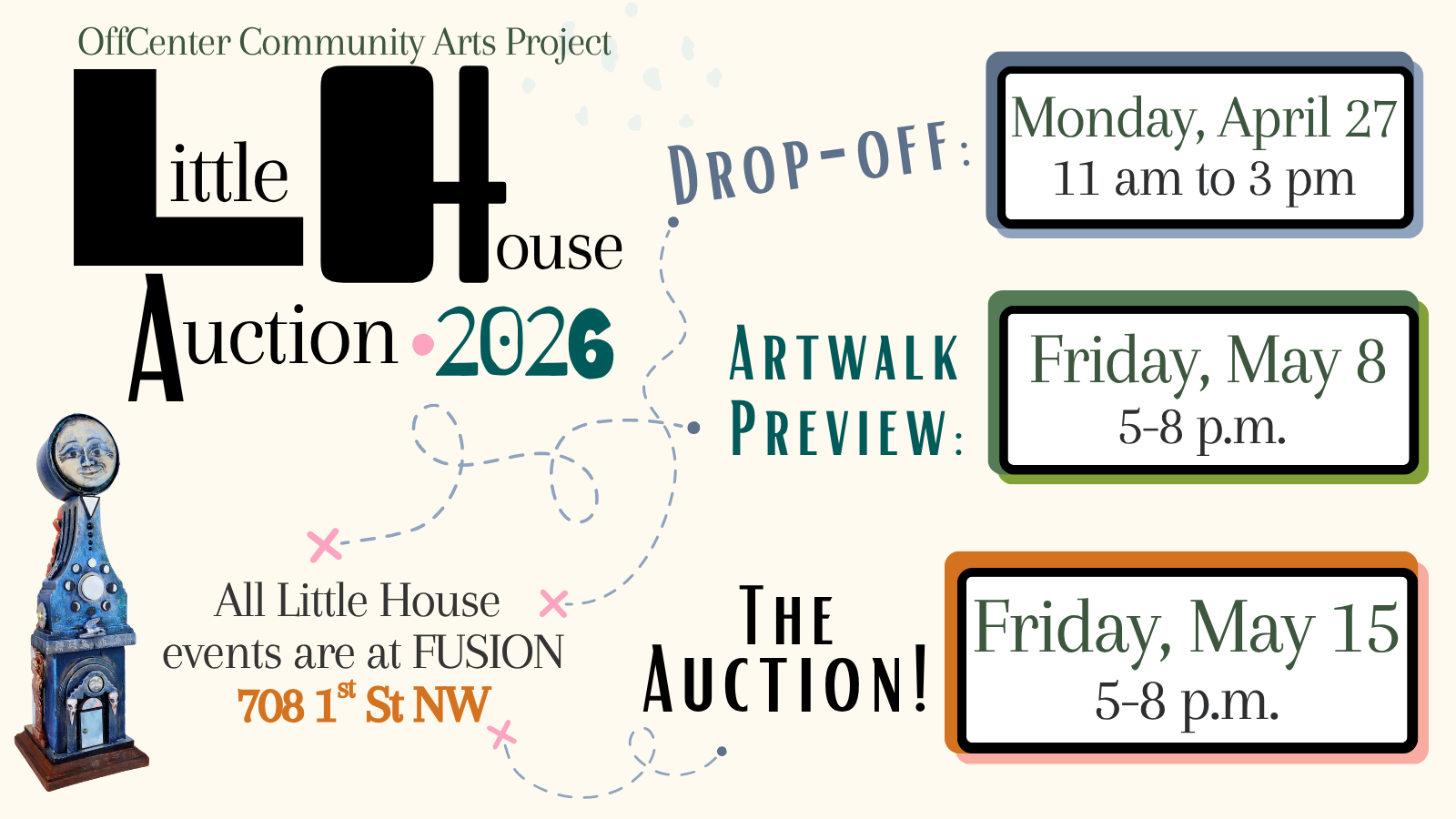 The Little House Auction is a free, festive celebration of the imaginative power of artists! With music, food, and 150+ amazing original Little House artworks, the silent auction is your chance to support OffCenter Arts important work — and win a gorgeous mini masterpiece or two while you’re at it!